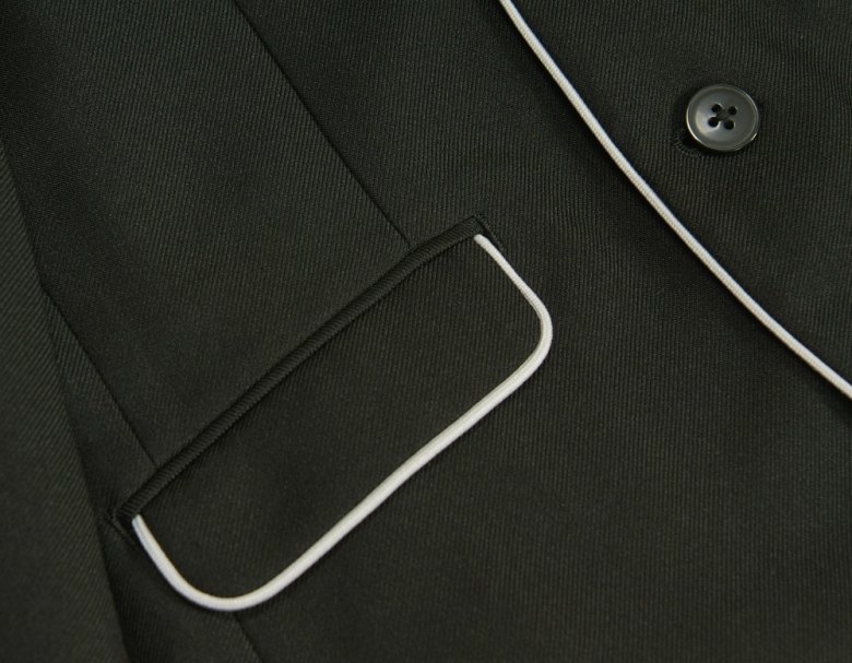 色目はパイピング使いのジャケットに衿袖クレリックタイプのシャツを合わせたおしゃれなタイプになります。
